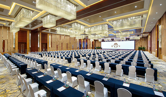 大宴会厅位于酒店二层,1600平米,层高8米,采用无柱式设计及高挑天花,强烈的空间感彰显宴会厅的恢宏大气。大宴会厅格调高雅,豪华气派,极富现代感,在晶莹璀璨的大型水晶灯的辉映下,可以同时举行800到1000人的鸡尾酒会。可灵活分割成三个独立小型宴会厅,空间间隔的灵活多变,可配合多种策划主题的场地要求。配有可载车的大型承重货梯,亦是举办大型车展的最佳场所。大宴会厅还拥有一处别致的会前场地,亲近自然的露台式设计,可以俯瞰落地窗外的别致景观。
